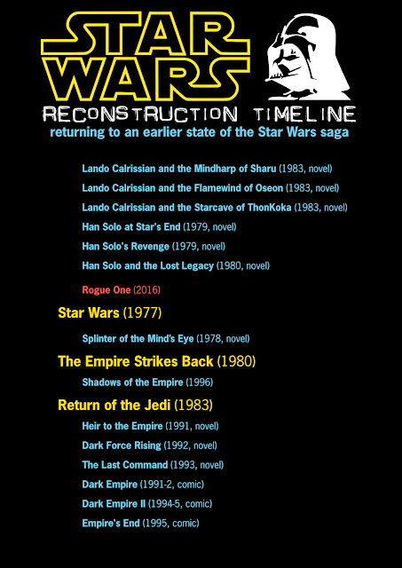 So, I've started regarding Star Wars as a shattered timeline where the narrative is broken. Different, competing versions of the Skywalker narrative exist simultaneously and it's up to the fan to (re)construct a timeline that appeals to them best. This is my attempt to create a personal, reconstructed timeline that (re)captures the spirit of the original trilogy.